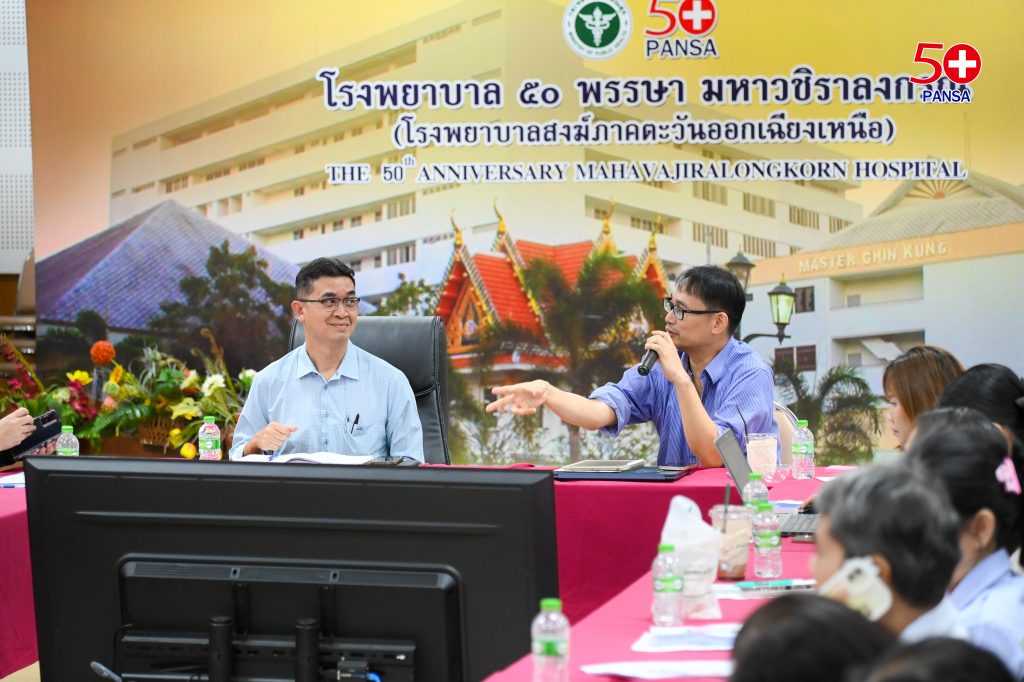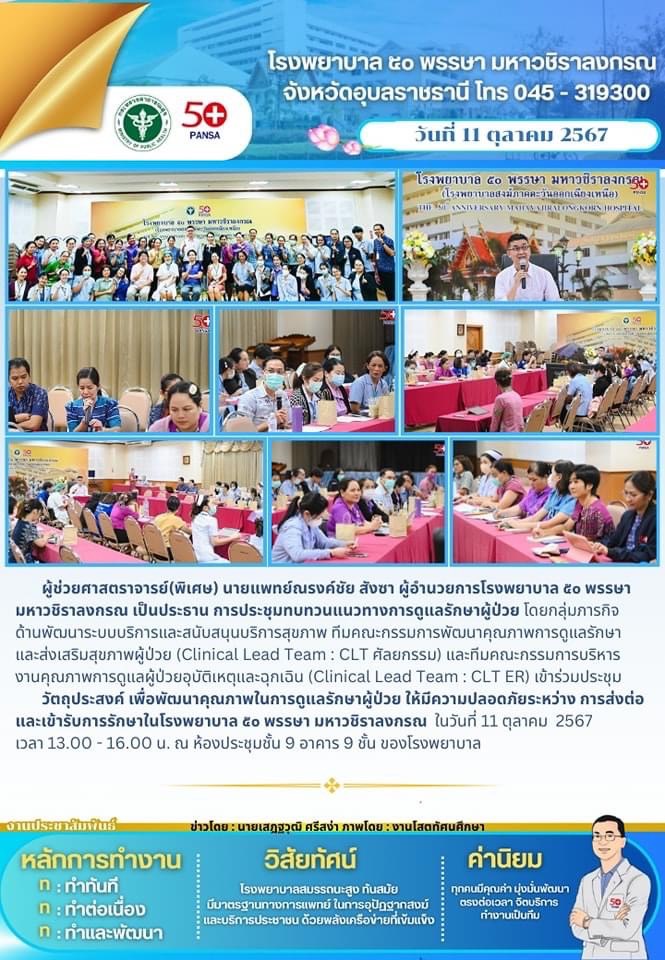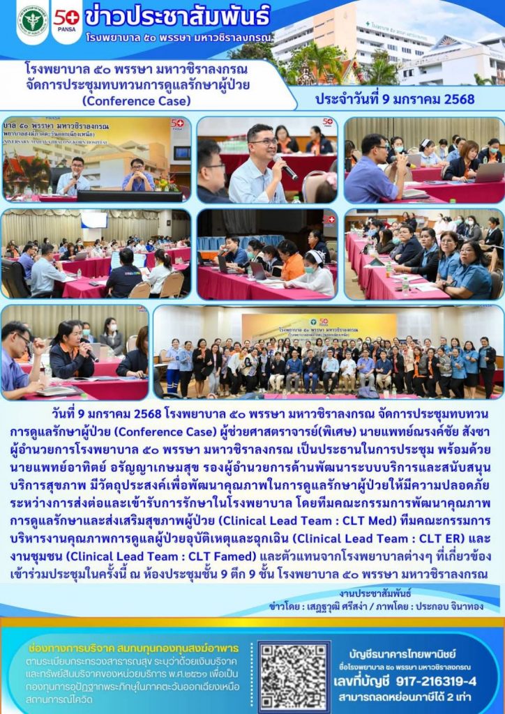 วันที่ 9 มกราคม 2568 โรงพยาบาล ๕๐ พรรษา มหาวชิราลงกรณ จัดประชุมทบทวนแนวทางการดูแลรักษาผู้ป่วย (Conference Case)ร่วมกับโรงพยาบาลเครือข่าย โดยมี ผู้ช่วยศาสตราจารย์(พิเศษ) นายแพทย์ณรงค์ชัย สังซา ผู้อำนวยการโรงพยาบาล ๕๐ พรรษา มหาวชิราลงกรณ เป็นประธานในการประชุม พร้อมด้วย นายแพทย์อาทิตย์ อรัญญาเกษมสุข รองผู้อำนวยการด้านพัฒนาระบบบริการและสนับสนุนบริการสุขภาพ กลุ่มงานพัฒนาคุณภาพบริการและมาตรฐาน กลุ่มภารกิจด้านพัฒนาระบบบริการฯโรงพยาบาล ๕๐ พรรษา มหาวชิราลงกรณ มีวัตถุประสงค์ เพื่อพัฒนาคุณภาพในการดูแลรักษาผู้ป่วยให้มีความปลอดภัยระหว่างการส่งต่อและเข้ารับการรักษาในโรงพยาบาล ๕๐ พรรษา มหาวชิราลงกรณ โดยทีมคณะกรรมการพัฒนาคุณภาพการดูแลรักษาและส่งเสริมสุขภาพผู้ป่วย (Clinical Lead Team : CLT Med ) ทีมคณะกรรมการบริหารงานคุณภาพการดูแลผู้ป่วยอุบัติเหตุและฉุกเฉิน (Clinical Lead Team : CLT ER) และงานชุมชน (Clinical Lead Team : CLT Famed) ในวันที่ 9 มกราคม 2568 เวลา 13.00 – 16.00 น. ณ ห้องประชุมชั้น 9 อาคาร 9 ชั้น โรงพยาบาล ๕๐ พรรษา มหาวชิราลงกรณ