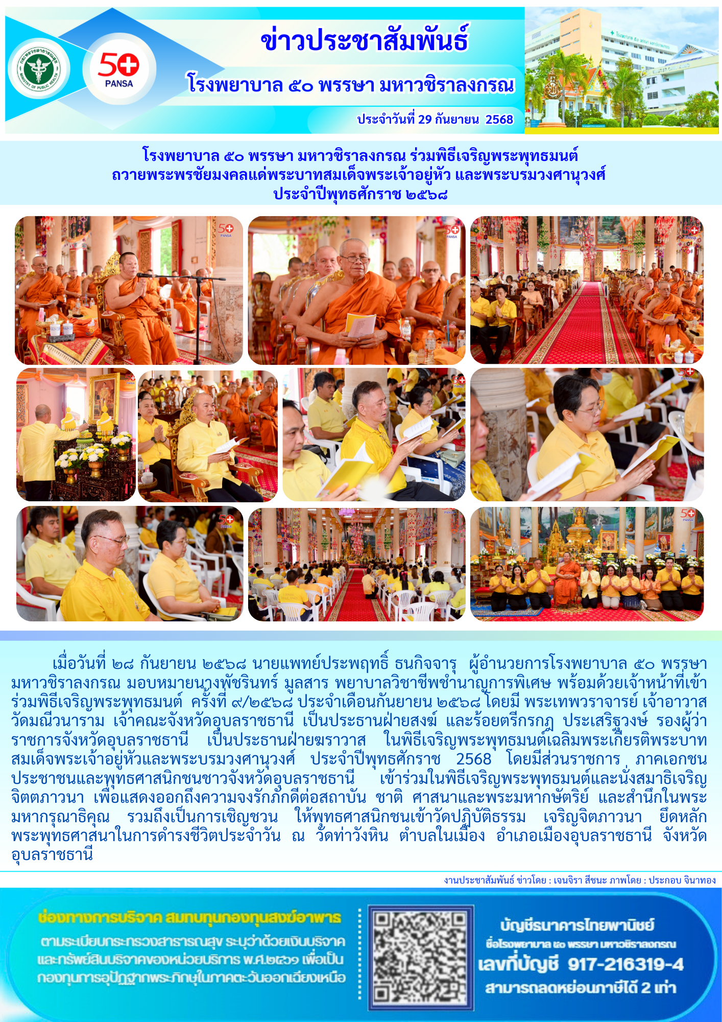 โรงพยาบาล ๕๐ พรรษา มหาวชิราลงกรณ ร่วมพิธีเจริญพระพุทธมนต์ ถวายพระพรชัยมงคลแด่พระบาทสมเด็จพระเจ้าอยู่หัว และพระบรมวงศานุวงศ์ ประจำปีพุทธศักราช ๒๕๖๘