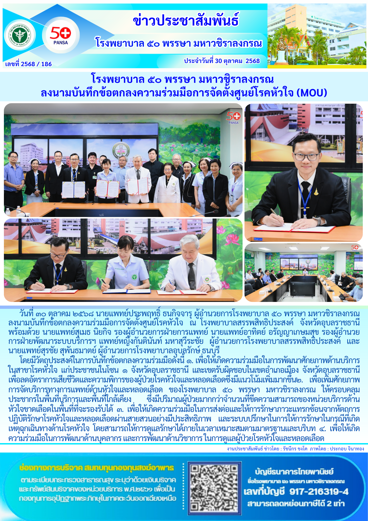 อ่านต่อโรงพยาบาล ๕๐ พรรษา มหาวชิราลงกรณ ลงนามบันทึกข้อตกลงความร่วมมือการจัดตั้งศูนย์โรคหัวใจ (MOU)