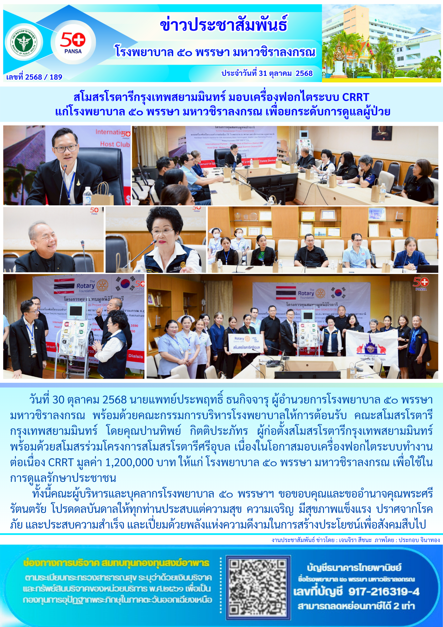 สโมสรโรตารีกรุงเทพสยามมินทร์ มอบเครื่องฟอกไตระบบ CRRT แก่โรงพยาบาล ๕๐ พรรษา มหาวชิราลงกรณ เพื่อยกระดับการดูแลผู้ป่วย