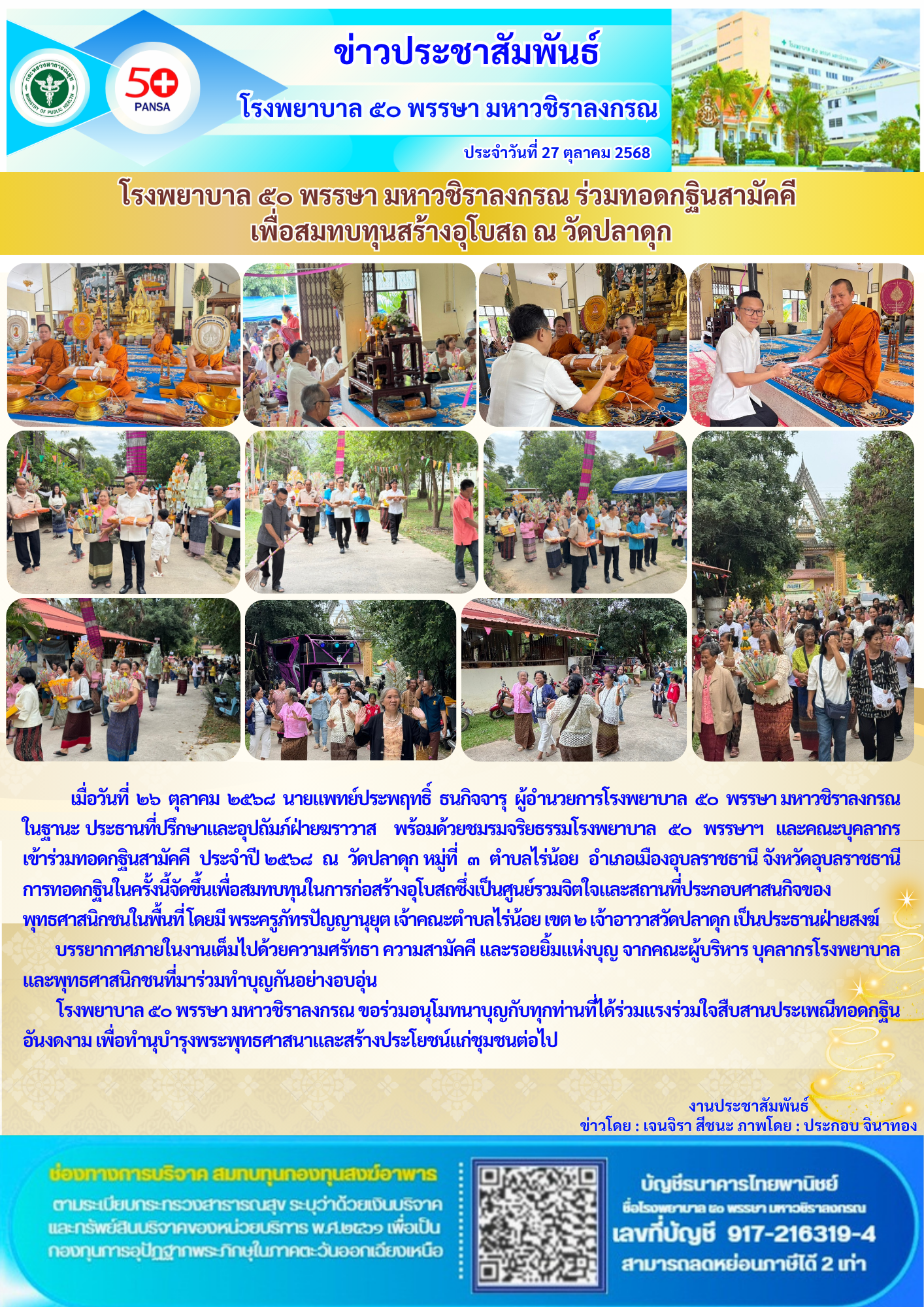 อ่านต่อโรงพยาบาล ๕๐ พรรษา มหาวชิราลงกรณ ร่วมทอดกฐินสามัคคี เพื่อสมทบทุนสร้างอุโบสถ ณ วัดปลาดุก