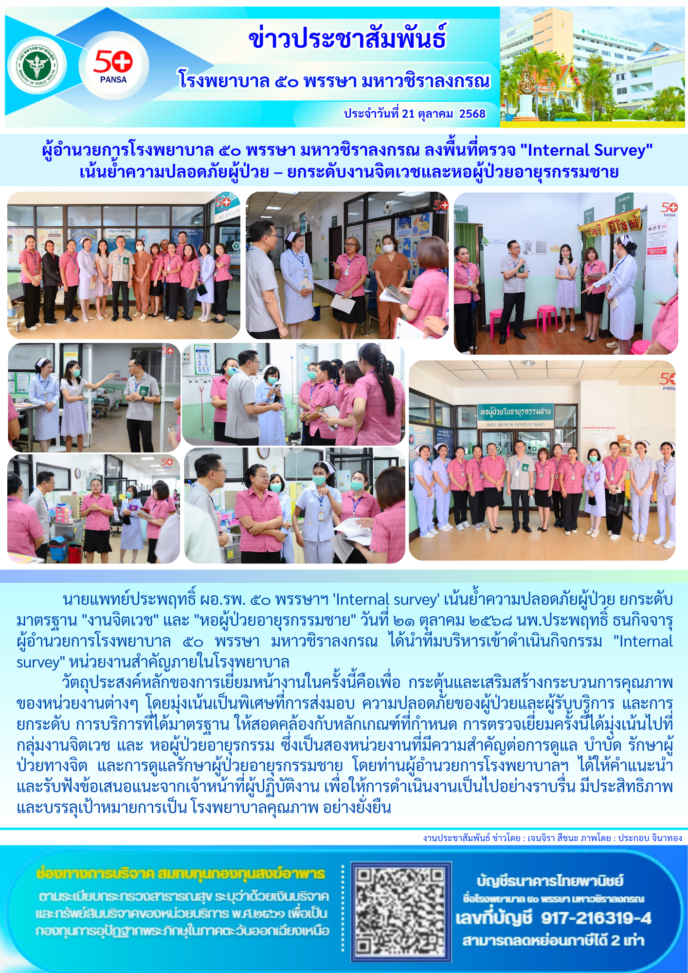 ผู้อำนวยการโรงพยาบาล ๕๐ พรรษา มหาวชิราลงกรณ ลงพื้นที่ตรวจ “Internal Survey” เน้นย้ำความปลอดภัยผู้ป่วย – ยกระดับงานจิตเวชและหอผู้ป่วยอายุรกรรมชาย