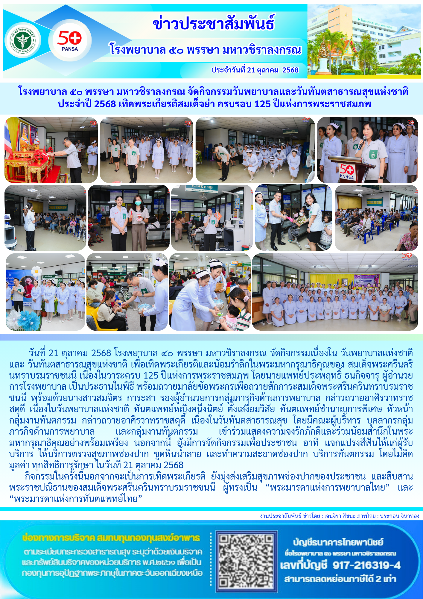 โรงพยาบาล ๕๐ พรรษา มหาวชิราลงกรณ จัดกิจกรรมวันพยาบาลและวันทันตสาธารณสุขแห่งชาติ ประจำปี 2568 เทิดพระเกียรติสมเด็จย่า ครบรอบ 125 ปีแห่งการพระราชสมภพ