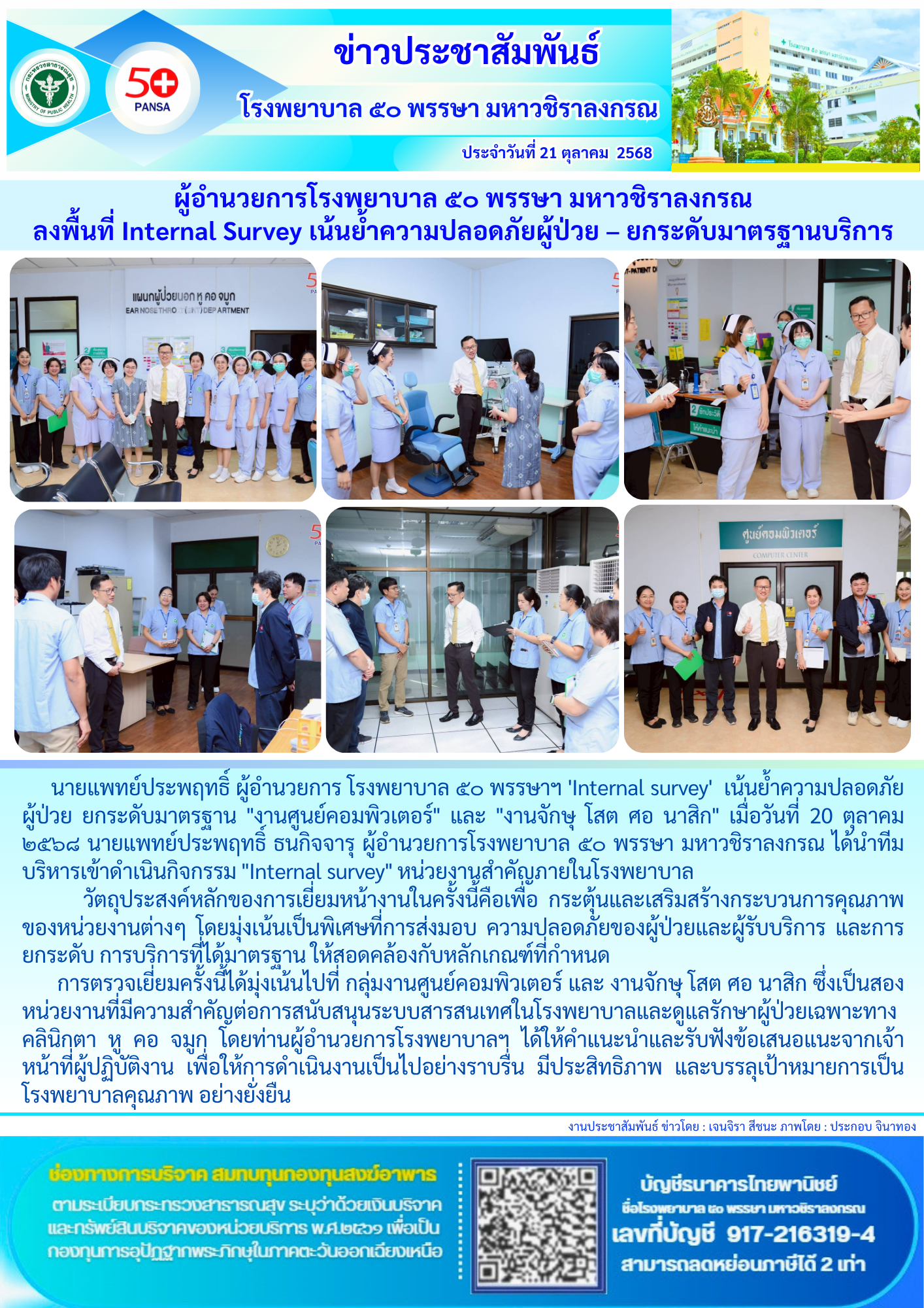 นพ.ประพฤทธิ์ ผอ.รพ. ๕๐ พรรษาฯ ‘Internal survey’ เน้นย้ำความปลอดภัยผู้ป่วย ยกระดับมาตรฐาน “เทคนิคการแพทย์” และ “งานจ่ายกลาง”