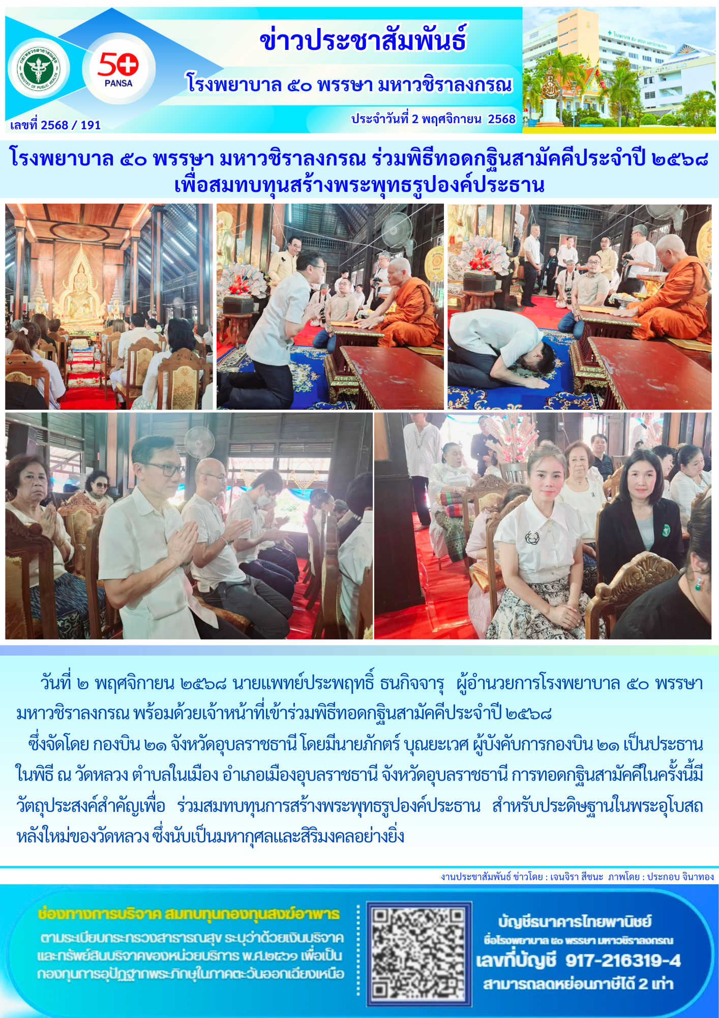 โรงพยาบาล ๕๐ พรรษา มหาวชิราลงกรณ ร่วมพิธีทอดกฐินสามัคคีประจำปี ๒๕๖๘ เพื่อสมทบทุนสร้างพระพุทธรูปองค์ประธาน