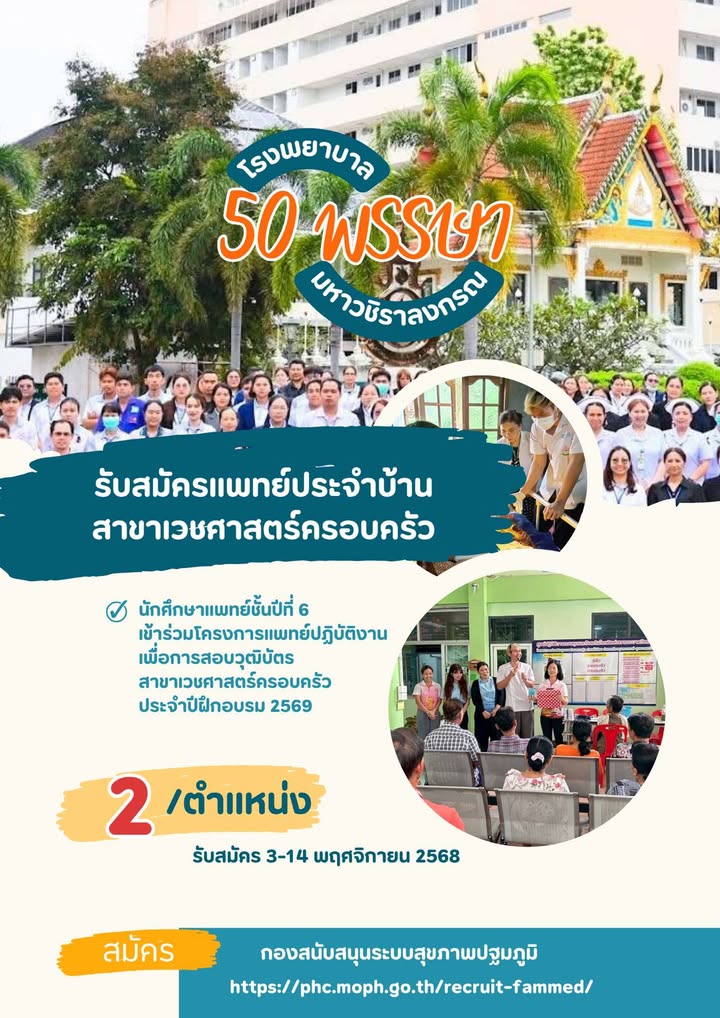 โรงพยาบาล ๕๐ พรรษามหาวชิราลงกรณ เปิดรับสมัครแพทย์ประจำบ้าน สาขาเวชศาสตร์ครอบครัว ปีการศึกษา 2569