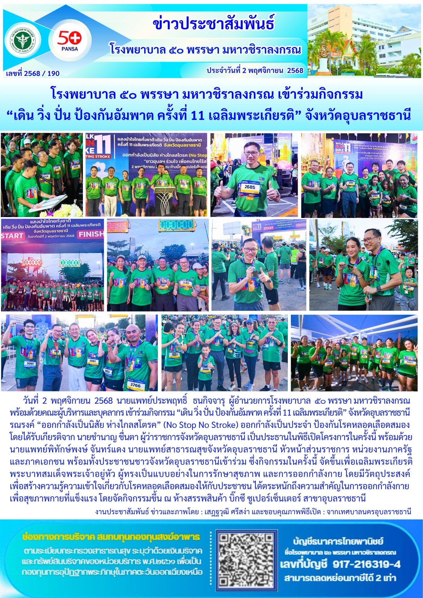 โรงพยาบาล ๕๐ พรรษา มหาวชิราลงกรณ เข้าร่วมกิจกรรม “เดิน วิ่ง ปั่น ป้องกันอัมพาต ครั้งที่ 11 เฉลิมพระเกียรติ” จังหวัดอุบลราชธานี